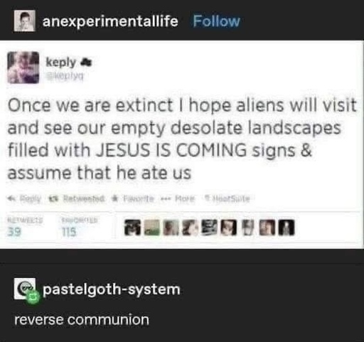 ickplant@lemmy.world · 9 hours agoEaten by Jesus lemmy.worldimagemessage-square6fedilinkarrow-up1400arrow-down13