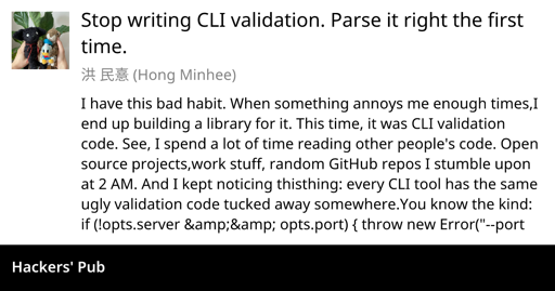 洪 民憙 (Hong Minhee)@lemmy.mlEnglish · 1 month agoStop writing CLI validation. Parse it right the first time.plus-squarehackers.pubexternal-linkmessage-square0fedilinkarrow-up11arrow-down10