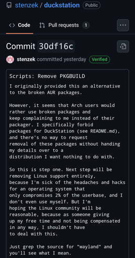 He has a point. Package managers are extremely stupid. Installing stuff on Linux is stupid. We need a 15th standard. Or one making all the existing ones work together.