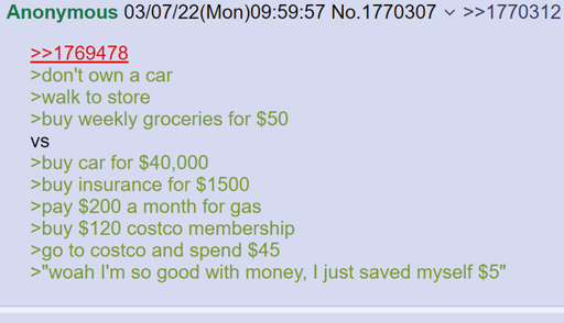 This sounds like a guy who is upset that he cannot afford a car so he comes up with reasons why its bad to own one and better to be in his position but due to lack of car owner experience just fucks the numbers all up and then looks stupid.