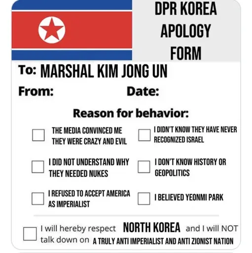 I don’t think “government criticism should be placed where due - even if that’s everywhere” is a very useful outlook for the world. I think we should first try to understand why countries are the way they are, and give our criticisms to the system that made them that way when appropriate. Again, think about the example of Palestine. Do Palestinian groups do things I disagree with? Absolutely. Is the way to tackle that situation to criticize them? No, because they’re already facing a war of genocidal extermination, so if you want them to do better, you should first try to remove the aggravating factors that are impeding democratic forces within their camp from winning over the reactionaries. It’s the exact same situation with NK: you don’t think their government is sufficiently transparent, it’s overly punitive, not democratic enough, etc etc? They won’t change those things as long as they’re under a genocidal blockade and the whole world wants them dead.
