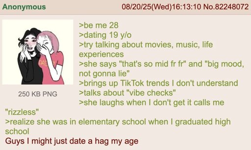 arrow-up1504arrow-down1imageAnon dates a 19 y/osh.itjust.works🍹Early to RISA 🧉@sh.itjust.worksM to Greentext@sh.itjust.works · 1 month agomessage-square198fedilink
