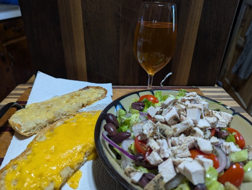 Greek chicken salad with fresh baked cheesey bread. Cheddar and smoked fontina. In the background is some 2009 plum wine I made. About 14% ABV.