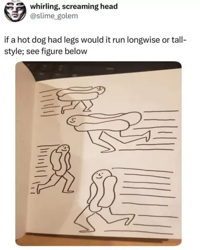 There is no way the hotdog could evolve sanding uprightI mean obviously the long way, because that’s how hotdogs are generally anthropomorphized.