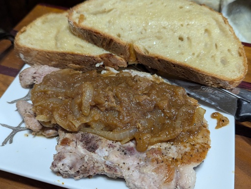 Cook the pork and set aside. Add onions and deglaze with 375ml salt free stock (homemade). Reduce to just barely coating the pan, add apple sauce (homemade). Serve with a starch (sourdough (homemade))