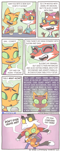 Most poly is nowhere near that, but just a person dating a person who also happens to be dating another person. End of story. The “quad dates” are ludicrous, and the foxy cat(?)'s explanation shows she’s way too involved in relationship that don’t, uh, involve her. Back off, be happier.