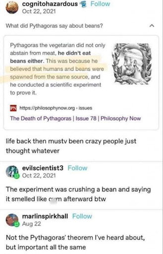 minus-squareCrazyLikeGollum@lemmy.worldlinkfedilinkEnglisharrow-up4·12 days agoIsn’t Pythagoras also the guy who believed that farts were the soul leaving the body? And that beans were therefore toxic and related to death.