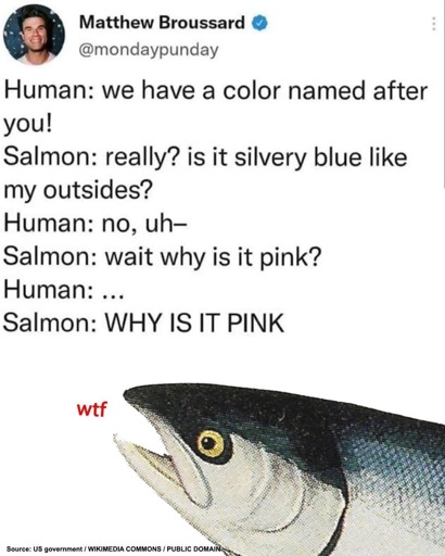 Or could it be that the place and time when salmon are easily seen by people is spawning season and at least some of the species turn a bright “salmon pink/red” colour at that time? They are dying then as well, but naturally, so it is still and end of life colour for them.