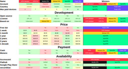 - Why is proton VPN excluded from the winners for open source, license, and based on, despite having the exact same values populated as the other 4 winners? - That’s another bug on my part. I’ll fix this in version 2.0 :)