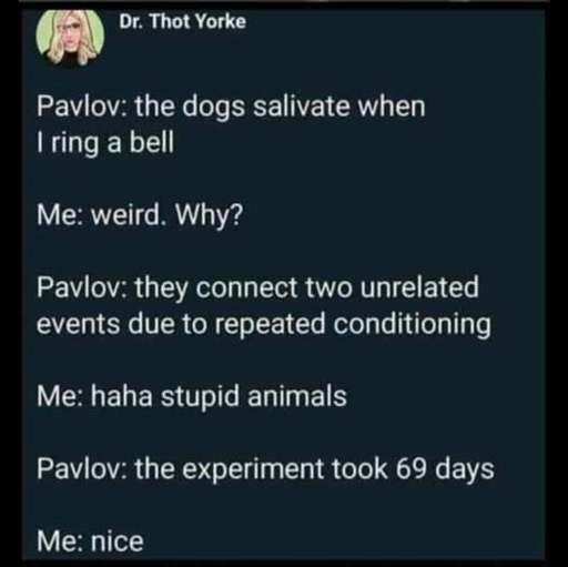 minus-squareangrystego@lemmy.worldlinkfedilinkEnglisharrow-up9·4 days agoPavlov: I hate animals. Schroedinger: Yeah, I hate them too.