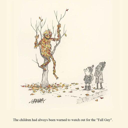 Alt Text: A cartoon illustration of two kids surprised to see a man made entirely of colored leaves sitting in a tree staring at them. Caption reads "The children had always been warned to watch out for the “Fall Guy.”
