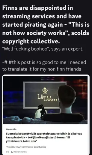 lanigerous@feddit.uk to Piracy: ꜱᴀɪʟ ᴛʜᴇ ʜɪɢʜ ꜱᴇᴀꜱ@lemmy.dbzer0.comEnglish · edit-24 days agoGood old Finland (subtitle is commentary, not in text)lemmy.blahaj.zoneimagemessage-square32fedilinkarrow-up1476arrow-down16file-text