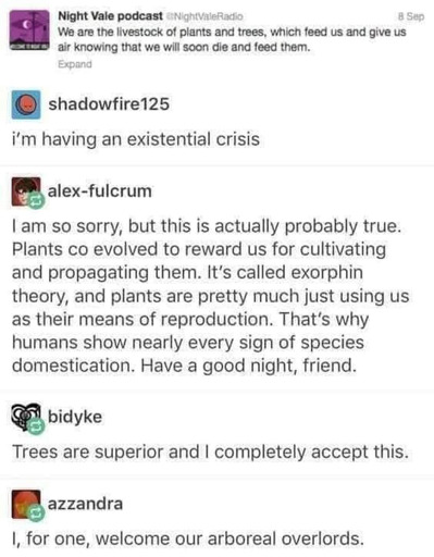 It’s because it doesn’t really make sense, plants came before animals. Plants do not need us to survive, but we need plants to survive.