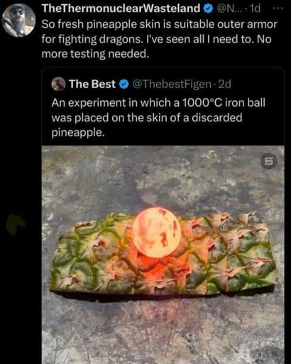 “My armour is like tenfold shields, my teeth are swords, my claws spears, the shock of my tail is a thunderbolt, my wings a hurricane, and my breath death!..Wait, is that…pinapple skin armour?? Oh, shit, I’m so fucked!”