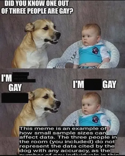 Man, I hate these stupid jokes. Every time someone goes “statistically, one in three people is X, now look at the person to your left and right”, I want to scream “HAHAHAHAHAHAH SO FUNNY THAT’S STATISTICS FOR YOU AMIRITE” with an absolutely straight face. Bad enough they don’t know how statistics work, but they’re perpetuating other people’s ignorance on top of that.