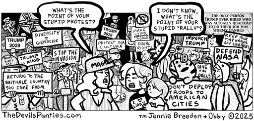 My only complaint is making the crowd sizes the same. The most I have seen doing a trump one is three. I often say I like to see the “counter” protesters as it shows how small (and quite frankly pathetic) that group is. Also cracks me up with the all the talk about how dangerous no kings2 would be especially in dangerous chicago that 3 maga folks felt safe having their flags while over 100k of nokings protestors rallied around them.
