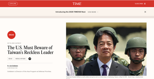 A recent trio of articles in Time Magazine has led to backlash in Taiwan, particularly seeing as the three articles frame current Taiwanese president Lai Ching-te as being dangerously pro-independence. The three articles are by thinktank analyst Lyle Goldstein, retired People’s Liberation Army senior colonel Zhou Bo, and Time editor Charlie Campbell.