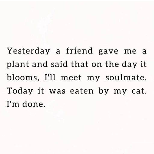 Black text on white background that reads “Yesterday a friend gave me a plant and said that on the day it blooms, I’ll meet my soulmate. Today it was eaten by my cat. I’m done.”